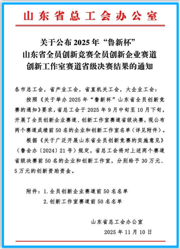 11月10日,2025年“鲁新杯”山东省全员创新竞赛全员创新企业赛道决赛结果公布,按照省级决赛名次排序,全省共有50家企业荣获“山东省全员创新企业”称号,海湾化学榜上有名。