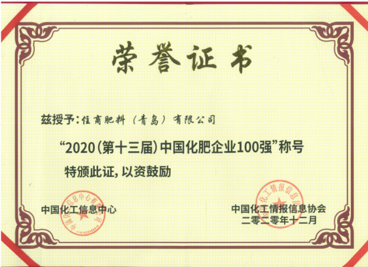 碱业发展住商肥料获“2020中国肥料企业100强”称号