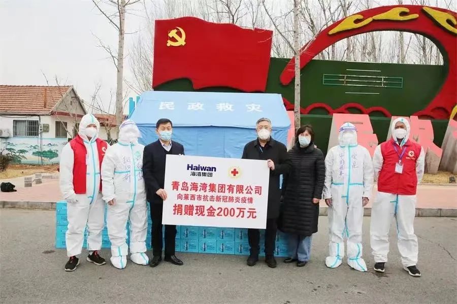吕英志代表莱西市红十字会接受海湾集团200万元爱心捐款,并向海湾集团表达由衷的感谢,莱西全市人民有信心、有力量抗击疫情、渡过难关。