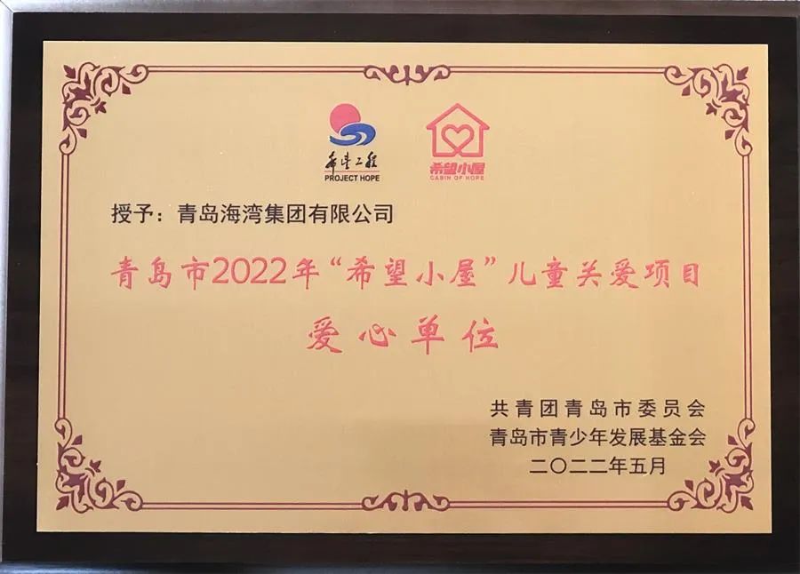 据悉,近期海湾集团618名员工积极响应团市委号召,自愿为“希望小屋”公益众筹项目捐款39387.96元,捐款总额在全市290多个团队中排名第4,荣获青岛市2022年“希望小屋”儿童关爱项目爱心单位称号。