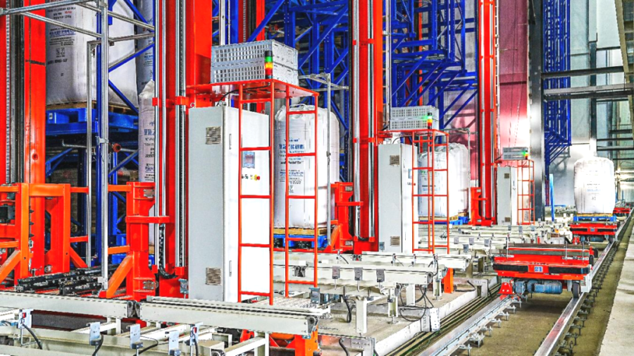 海湾化学智能化立体仓库主要由立体货架、堆垛机、输送机、WMS(仓库管理系统)以及辅助设备组成。通过RGV/AGV及相关物流运输设备,进行货物的智能存取、搬运,再依托WMS等仓库管理系统,最终实现货物自动识别、检测、分拣等一体化流程。
