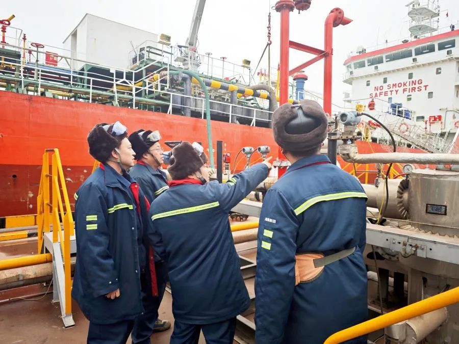 为尽快解决问题,运行三班立即向企业汇报并启动应急预案,成立由机长、夹板主管和岸方技术骨干组成的应急小组,对船方管线漏点进行系统性排查与定位,他们采用“分段隔离法”缩小漏点范围,利用超声波测漏仪进行逐段管道、法兰的检查,发现多处螺栓松动,经过5个多小时的连续奋战,班组完成11处漏点修复,试压率达标100%,确保船舶按期完成装货首航,得到了客户的高度认可。