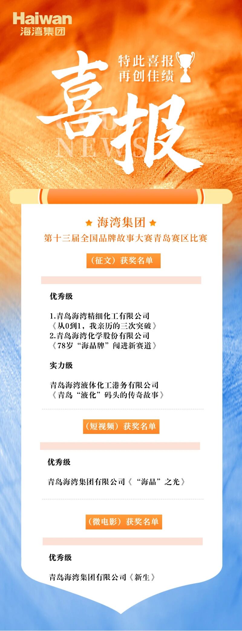 本次比赛共有来自国网、东阿阿胶、青岛啤酒、北京电力等近百家企业97篇(个、部)作品参加比赛。其中,海湾精化王亚飞撰写的《从0到1,我亲历的三次突破》、海湾化学夏春超撰写的《78岁“海晶牌”闯进新赛道》获得优秀级认定;海湾港务刘爱新撰写的《青岛“液化”码头的传奇故事》获得实力级认定。集团提报的短视频《“海晶”之光》、微电影《新生》分别获得优秀级认定。