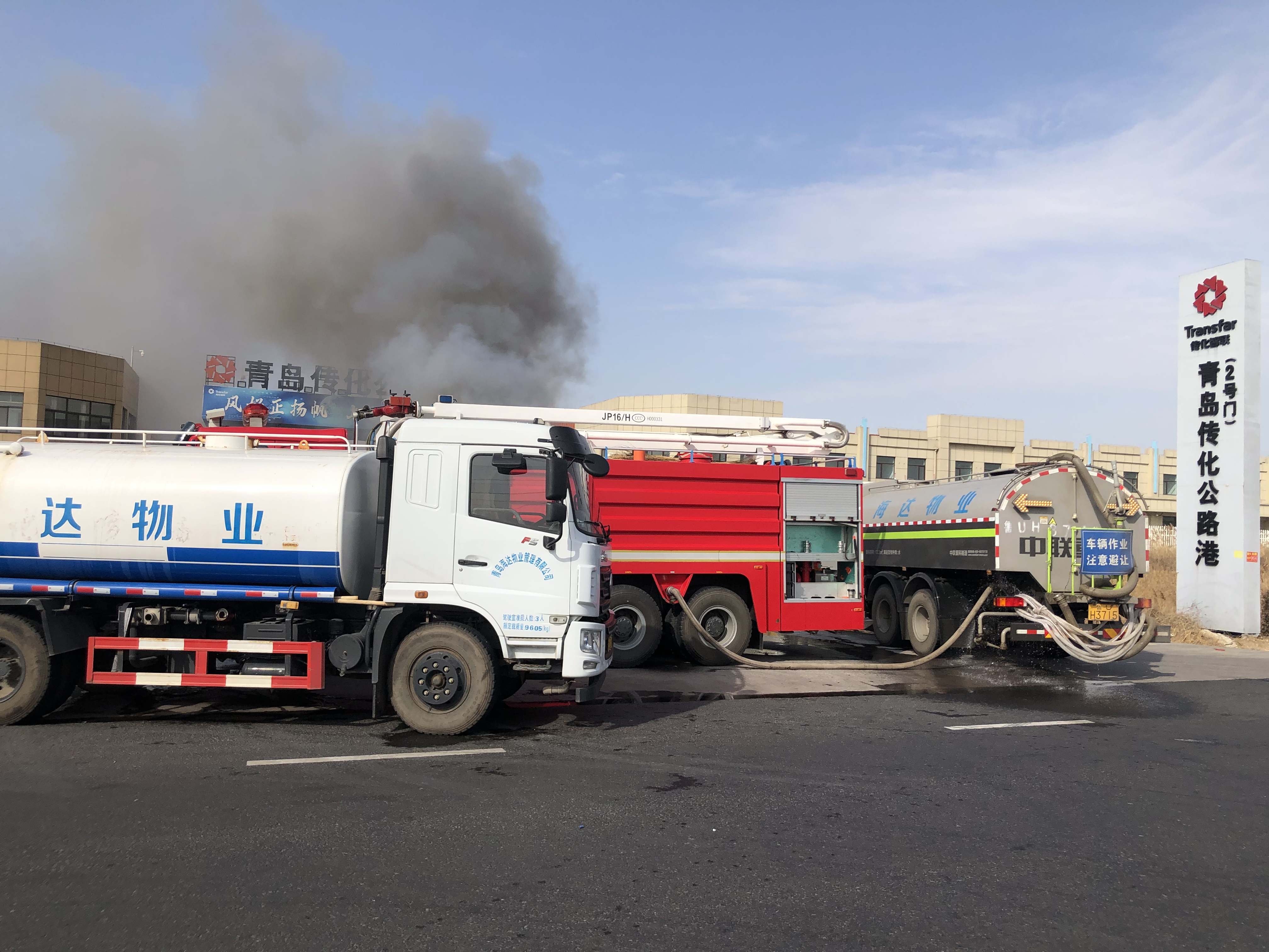 2月23日上午9点30分左右,海达物业环卫作业车驾驶员程龙行驶至青岛传化物流港东门入口处时,发现不远处冒起了滚滚浓烟,原来是一辆载满货物的半挂车突发着火,货车上满载空调外机,易燃的纸壳包装加上当天的大风天气,火势迅速蔓延至全车。司机已拨打119火警电话,但消防车还需要一点时间才能赶到。